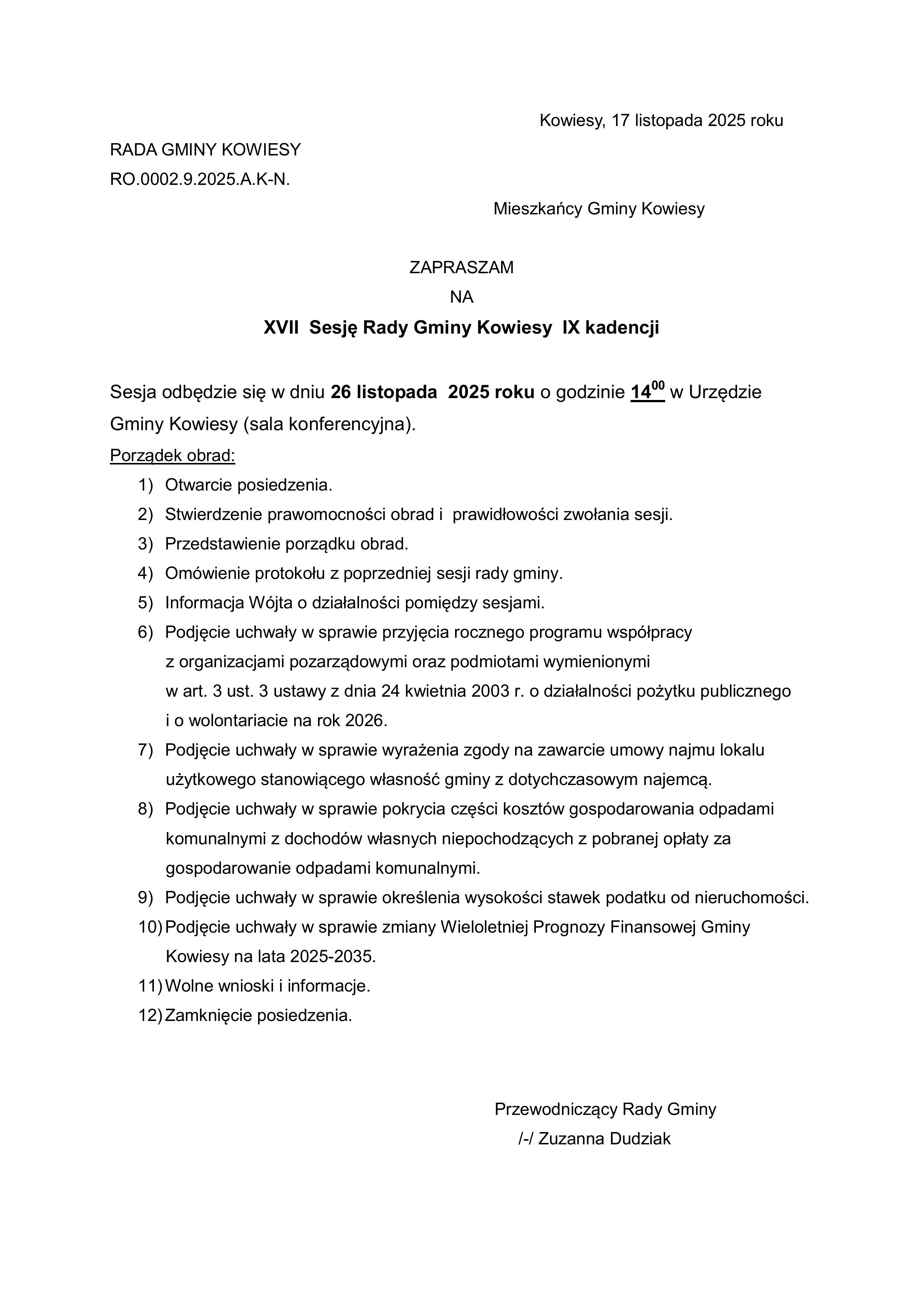 Zaproszenie na XXV Sesję Rady Gminy Kowiesy w dniu 27 stycznia 2017 roku